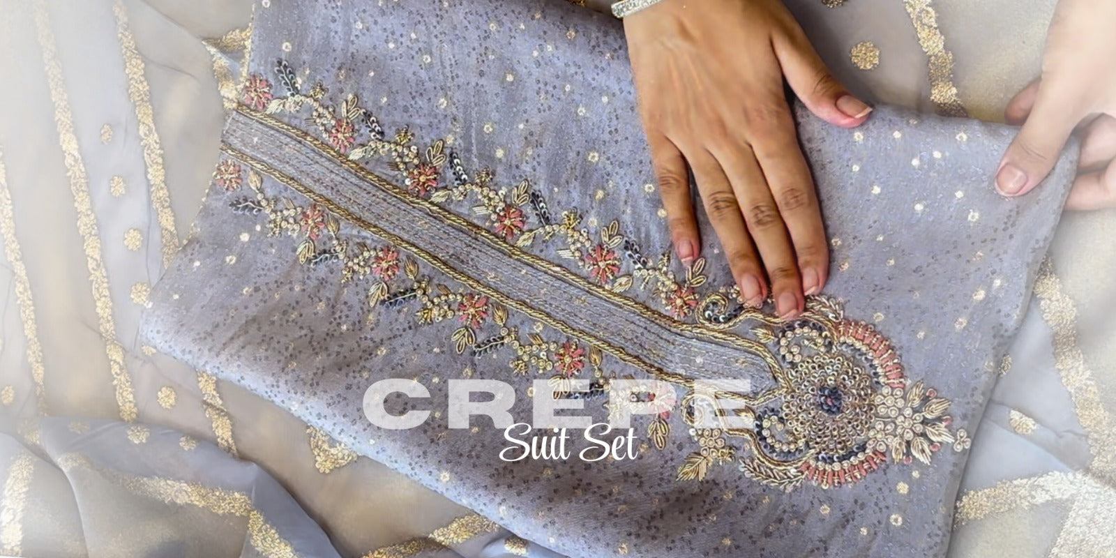 Elegant Grey & Green Crepe Suit Set with Embroidered Dupatta