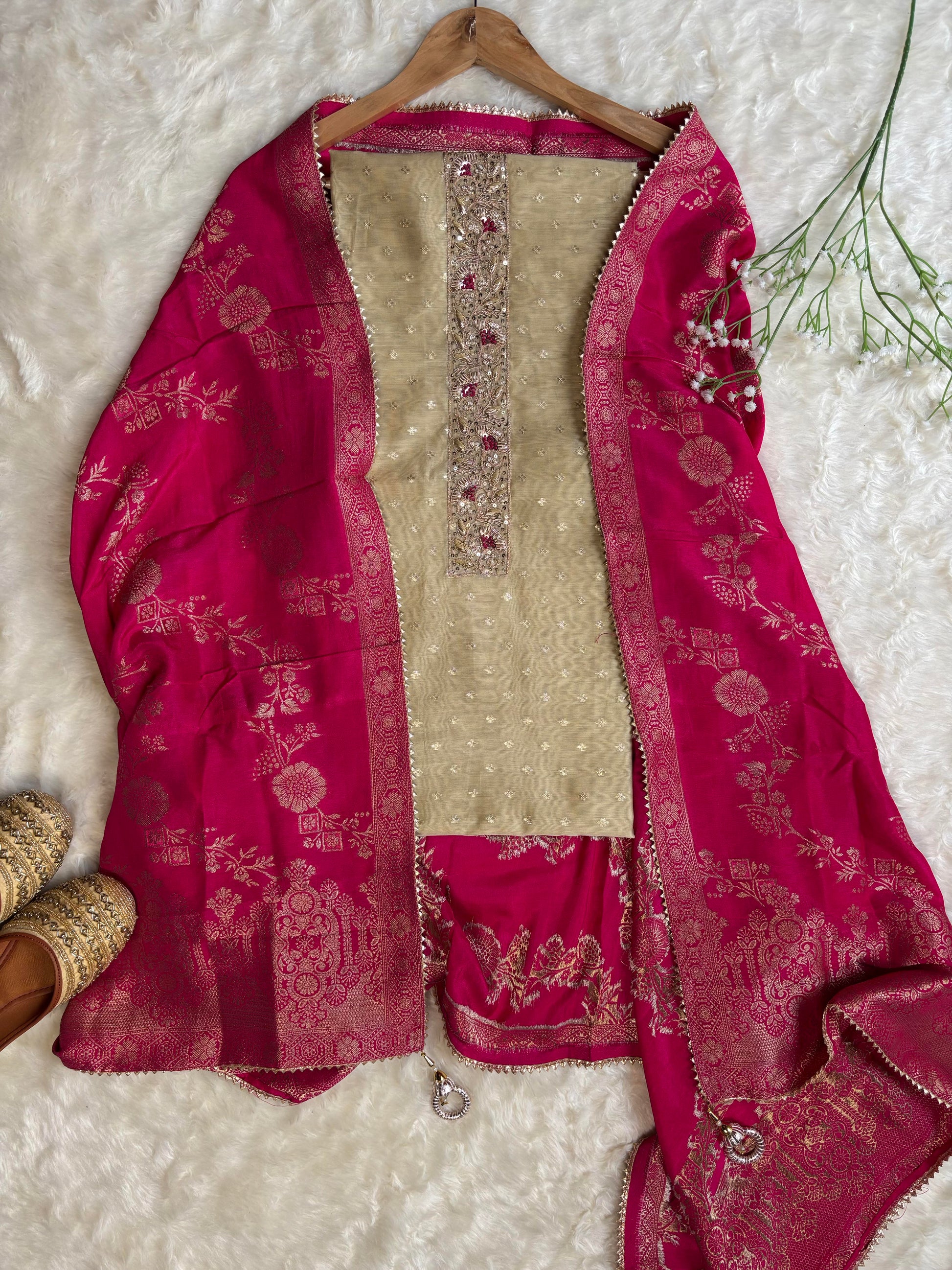 An elegant beige Chanderi suit set crafted with subtle festive detailing. The kurta is tailored in fine Chanderi fabric with zari weaving and a beautifully designed neckline adorned with dabka resham French knots pearls zari and sequins finished with a lace border. It is paired with a soft cotton silk bottom and a luxurious Banarasi weaving dupatta highlighted with lace borders and tassels.