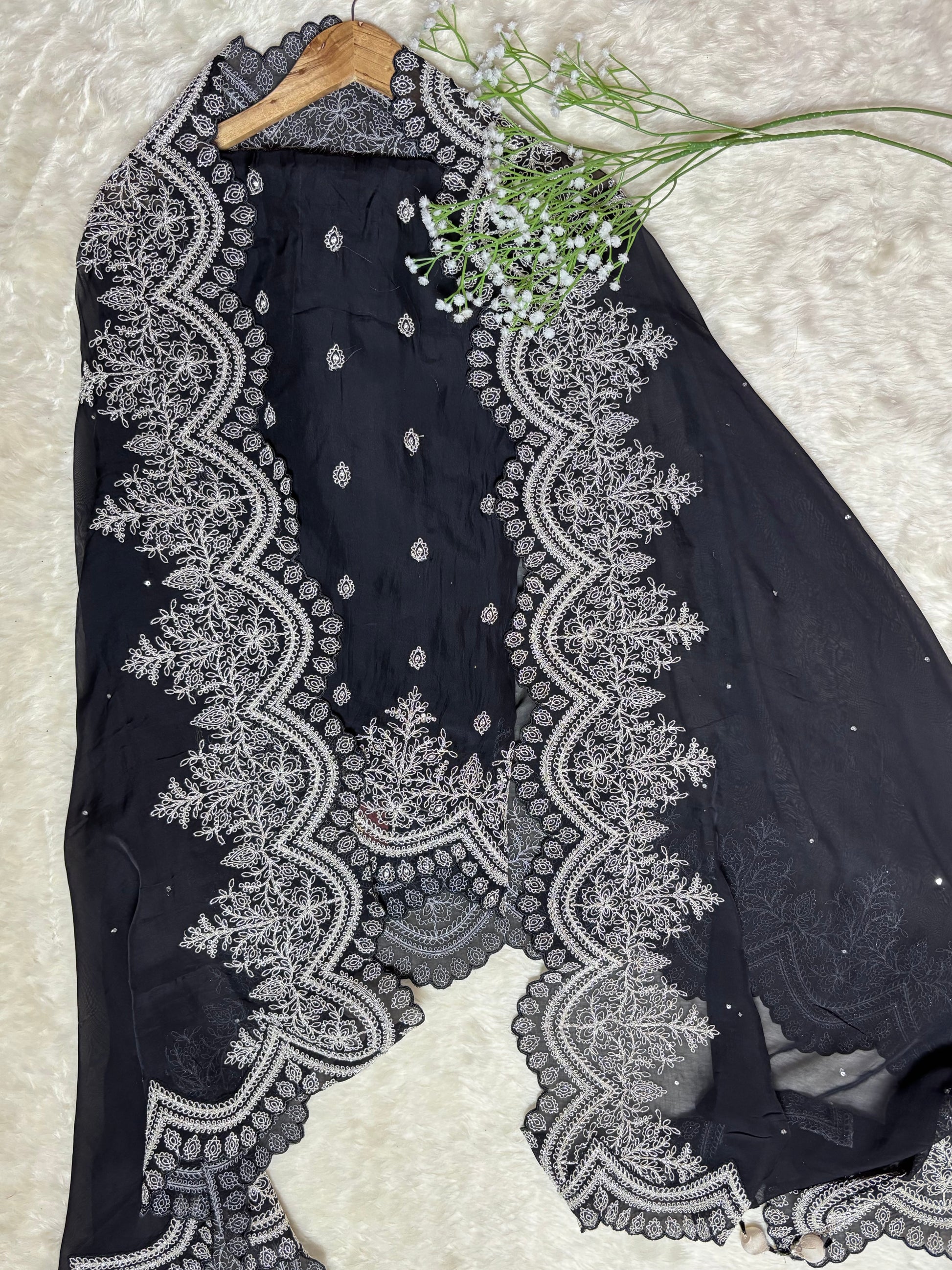 - Dupatta: Organza with resham scallop embroidery tassels & sequins