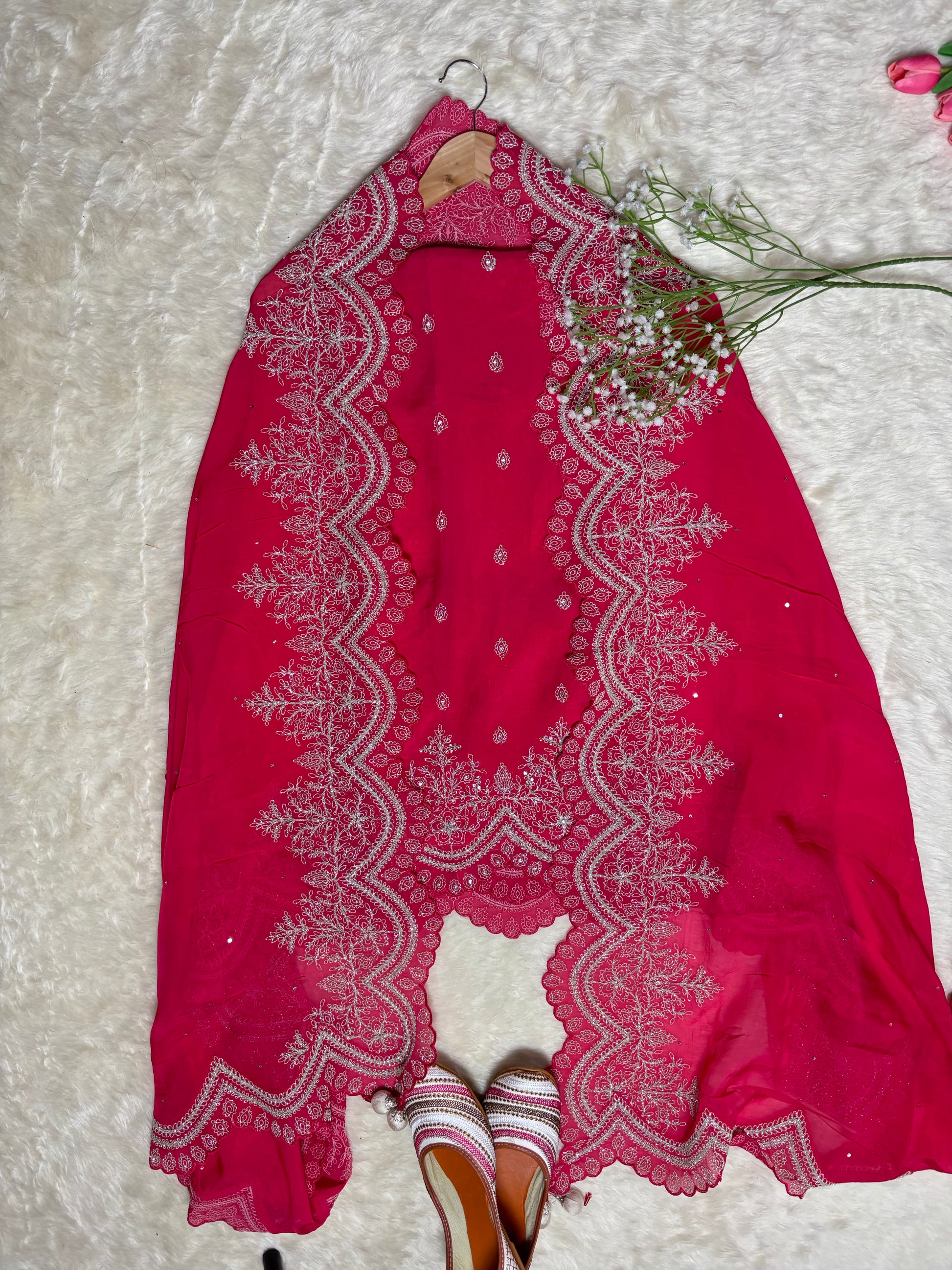 Elevate your festive look with this semi stitched organza suit featuring a pearl detailed neckline stone highlighted dori bootis and resham scallop embroidery. The organza dupatta with tassels and sequins adds charm while the chinon bottom ensures comfort perfect for parties and celebrations.