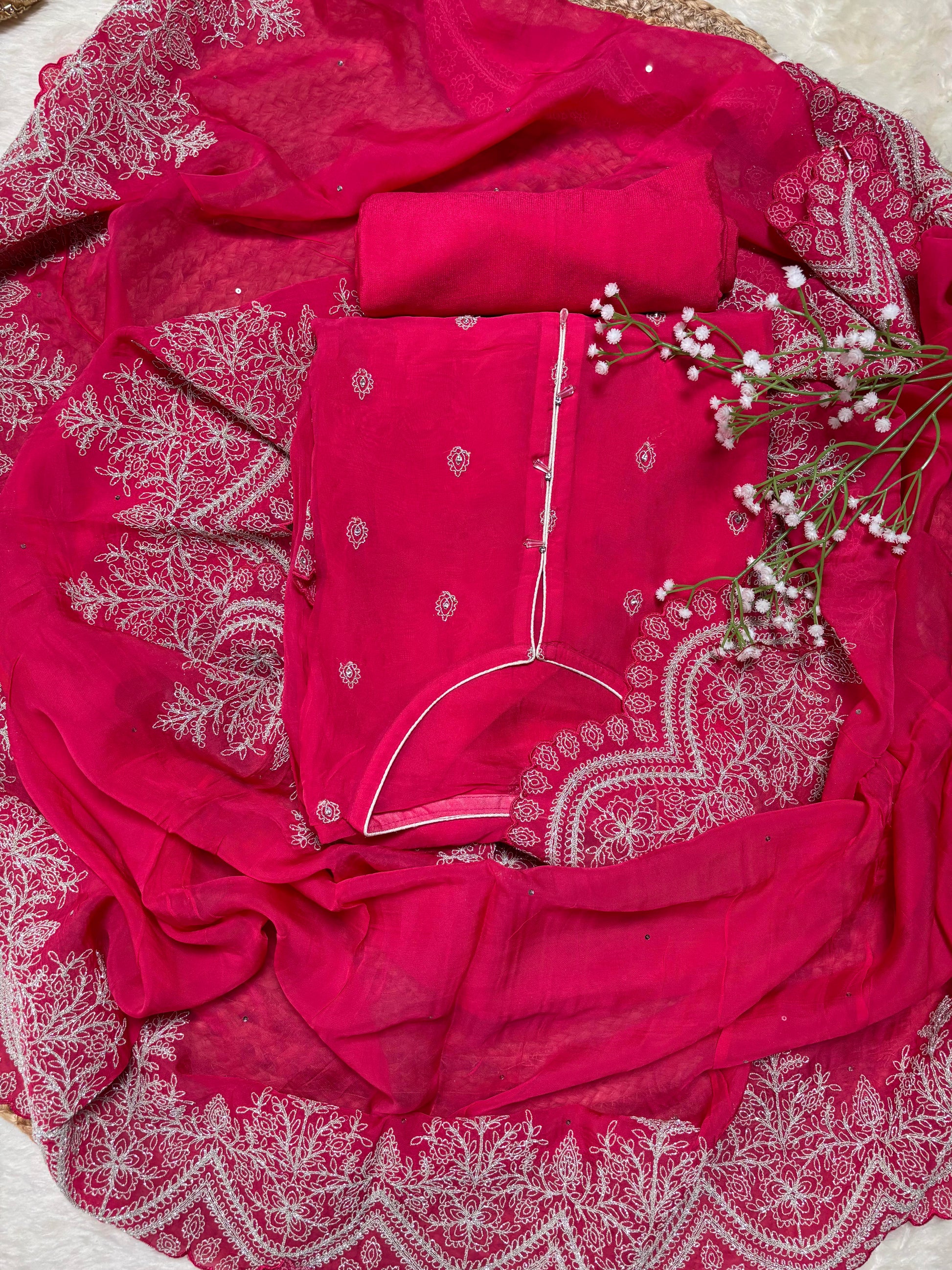 Black & Hot Pink Semi Stitched Organza Suit with Pearl Dori & Sequin Embroidery