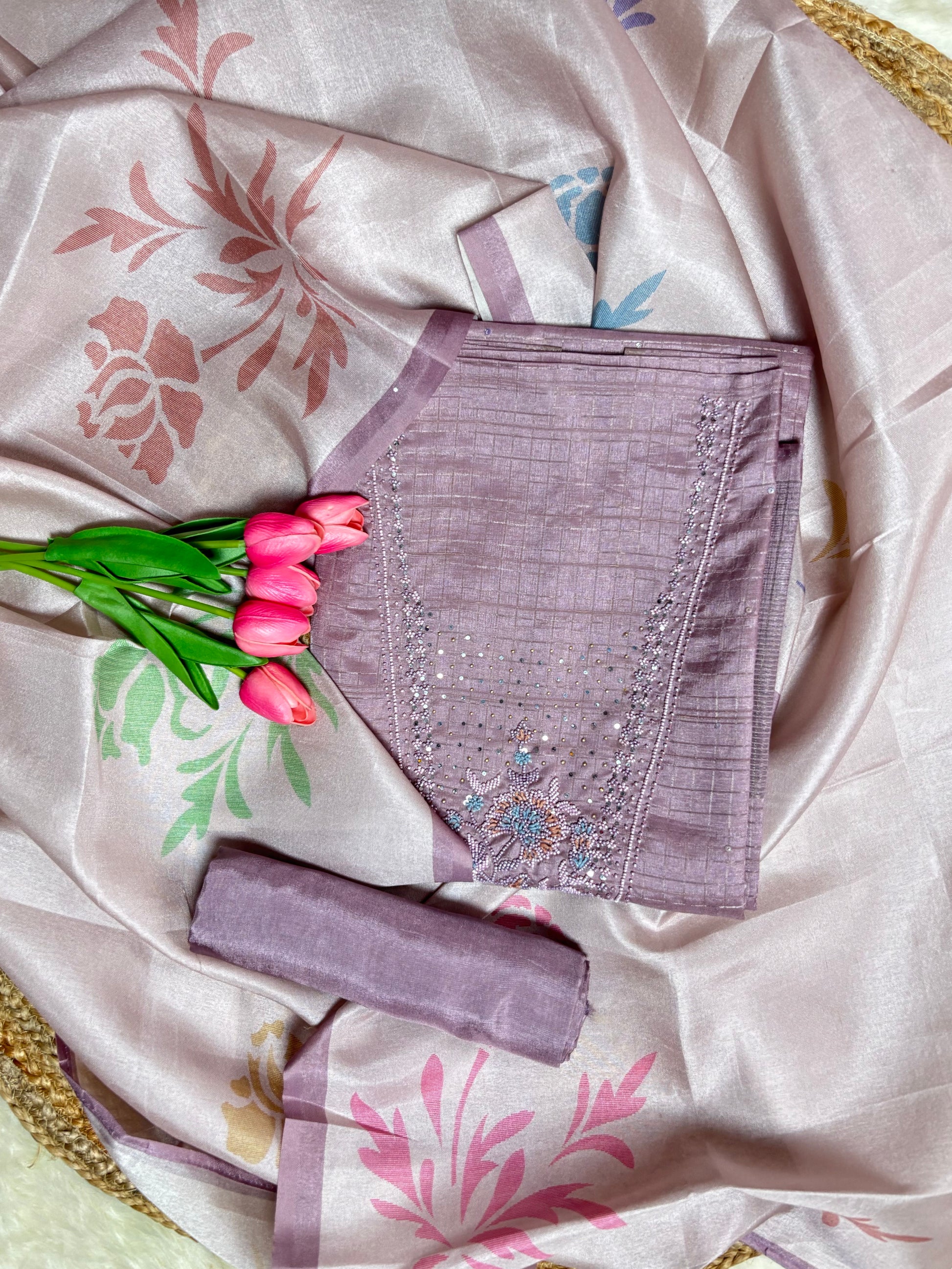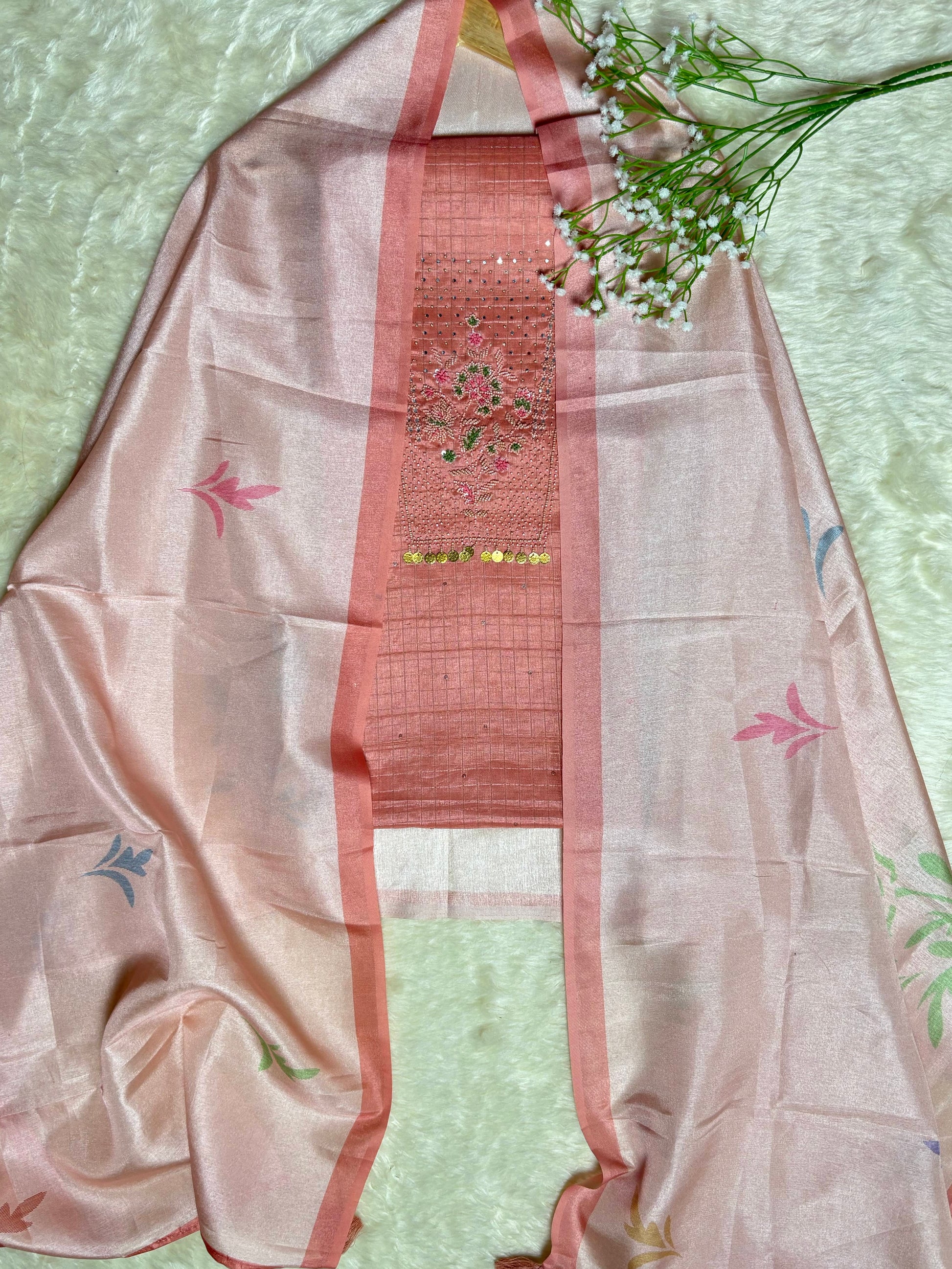 Step into effortless elegance with this Tussar silk suit set featuring delicate zari weaving in a classic check pattern enhanced with scattered sequins for a subtle shimmer. The neckline is beautifully designed with floral embroidery adorned with pearls sequins resham mirror work and finished with chic metal coin hangings giving it a festive charm. Paired with a Chanderi tussar dupatta embellished with floral motifs and tassels on all four sides and a comfortable crepe bottom this ensemble is perfect for weddings festive gatherings and special occasions.