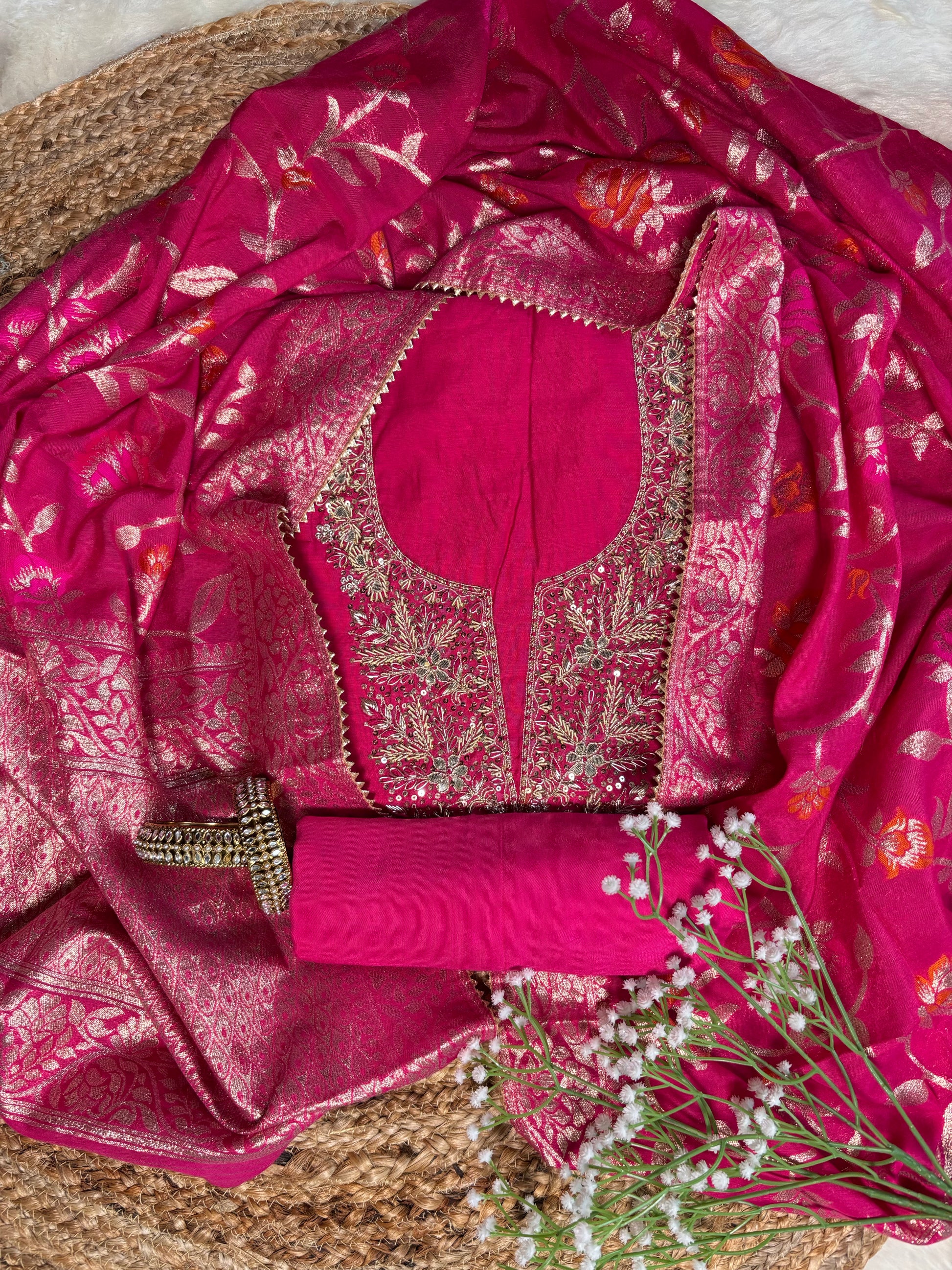 Hot Pink Embroidered Kurta with Banarasi Dupatta