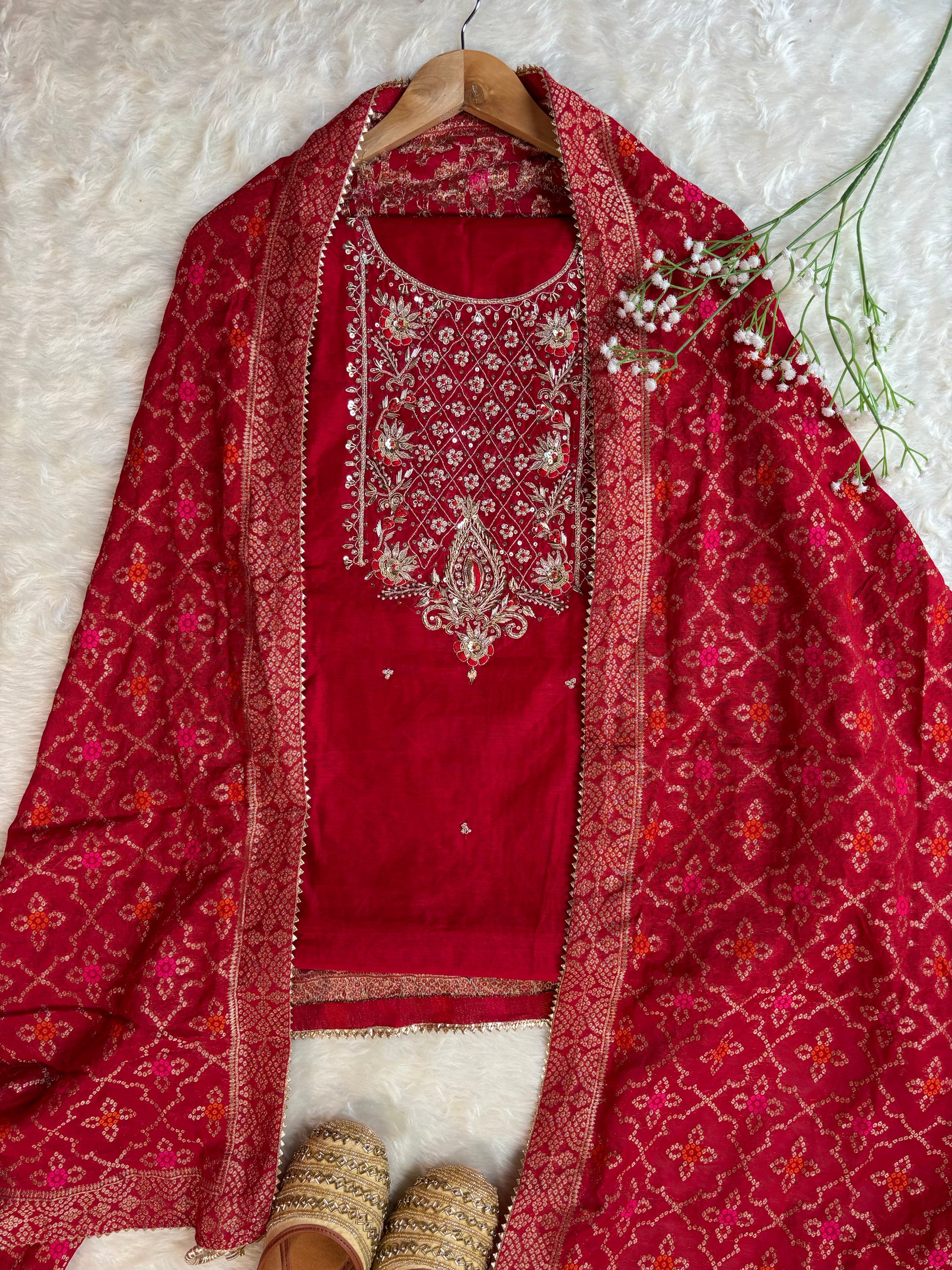 A traditional red Chanderi suit set crafted with elegance and rich festive detailing. The kurta is tailored in fine Chanderi fabric featuring an intricately designed neckline embellished with resham, dabka, moti, zari and gotta patti. All over dabka and moti booti add a refined charm. It is paired with a cotton silk bottom for comfort and a Banarasi weaving dupatta finished with lace borders and tassels for a luxurious appeal.